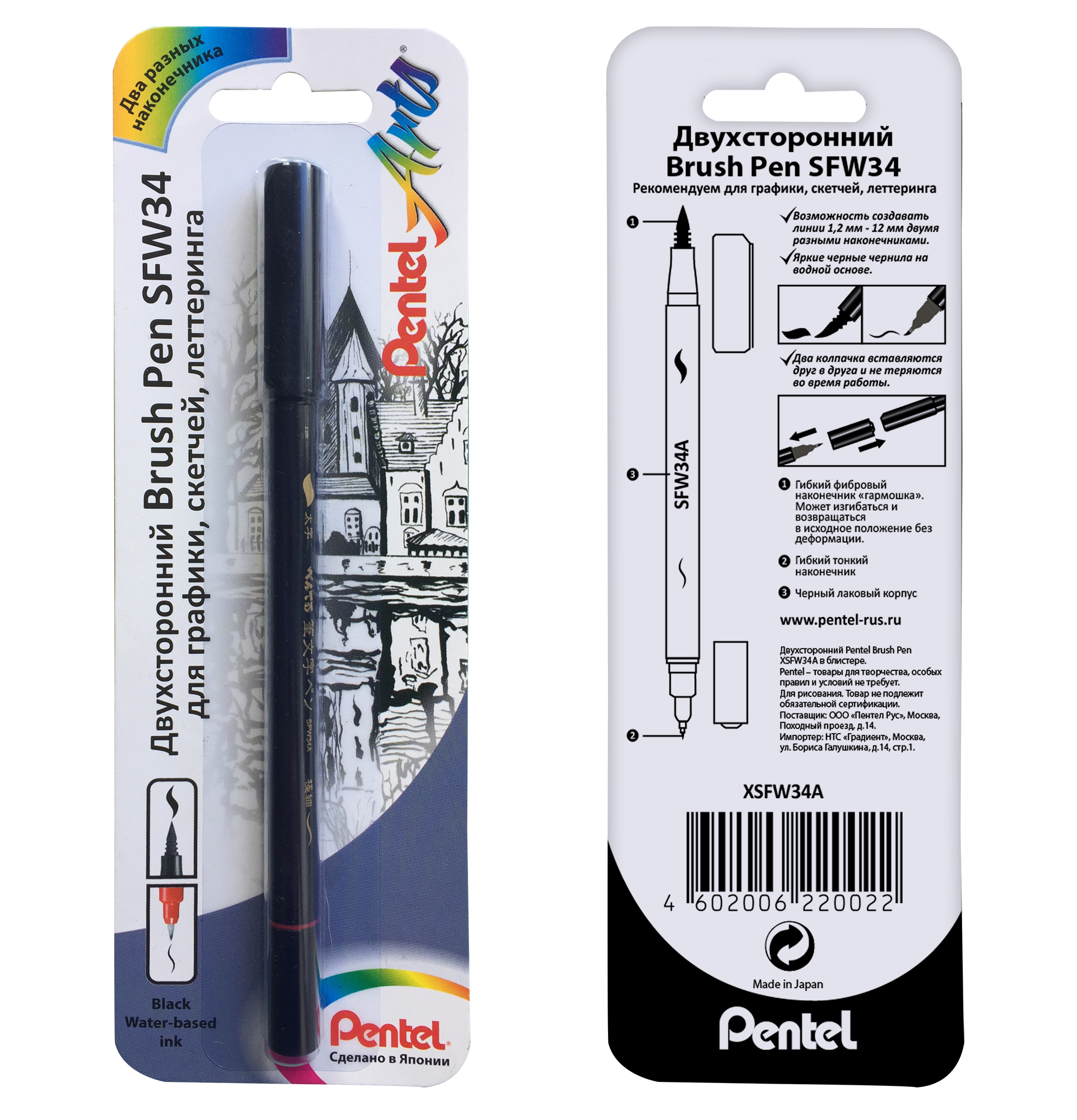 Двухсторонний брашпен Brush Pen SFW34A с черными чернилами